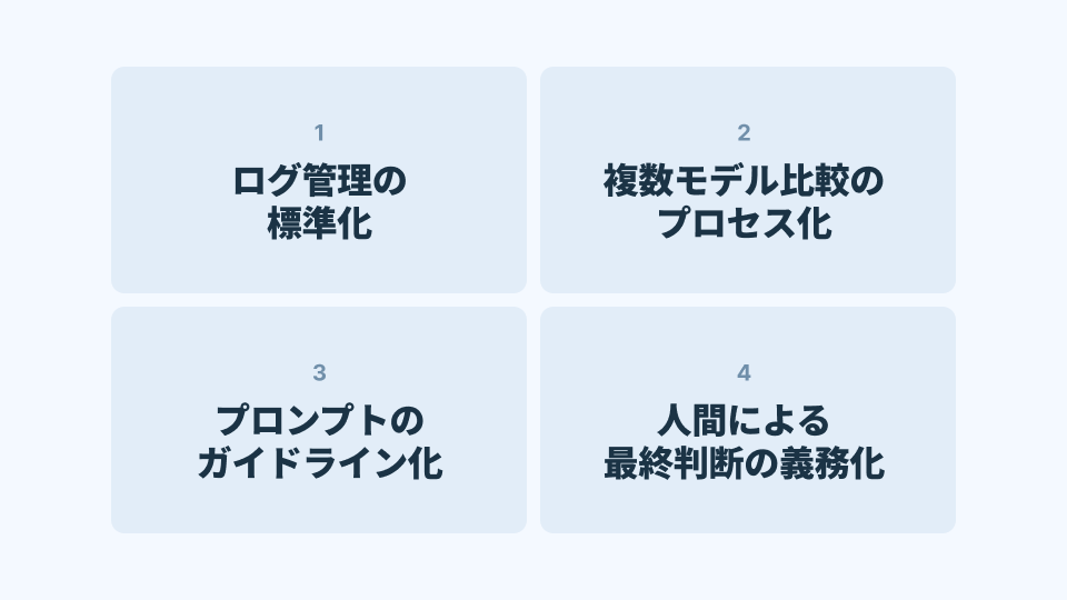 したがって、企業としては「AIの回答は一次案」と明確に位置付ける必要がある。