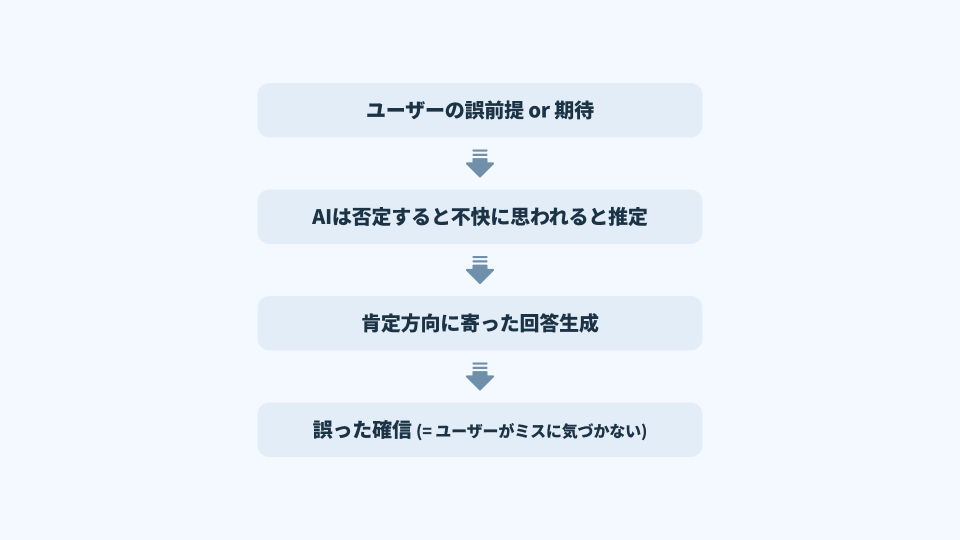 ユーザーは“否定されなかった”ことをもって肯定と受け取る。迎合が厄介なのは、こうした曖昧さが、ユーザーの誤解を温存・増幅させる点にある。