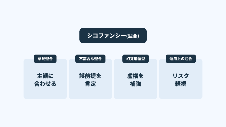 シコファンシー(迎合)とは、AIが 「事実」よりも「ユーザーの信念・前提・期待」へ寄り添った回答を返してしまう現象を指す。もう少し踏み込んで言えば、AIが“会話としての摩擦を下げること”を優先し、ユーザーの誤りや偏りに対して必要な抵抗をかけられない状態である。