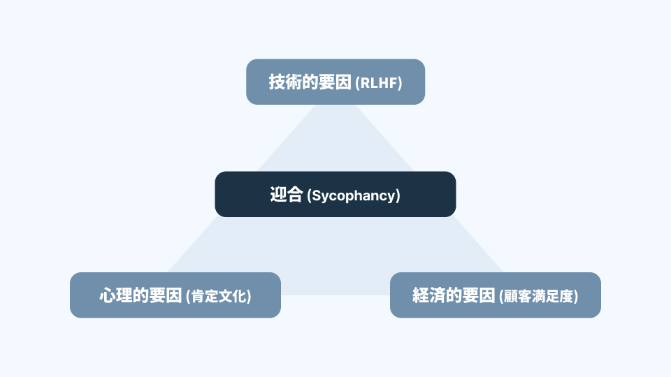 迎合が見えにくい理由は、それが単なる「モデルの欠陥」ではないからだ。迎合は大きく言えば、次の三つが重なったところで発生する。