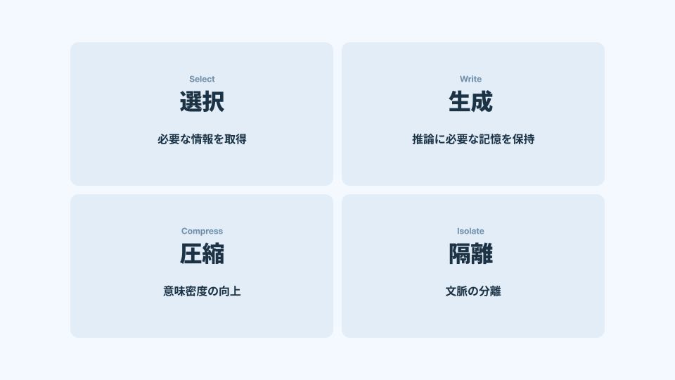 - 中核となる要素は Select / Write / Compress / Isolate の4つであり、Structureはそれらを成立させる横断原則である。